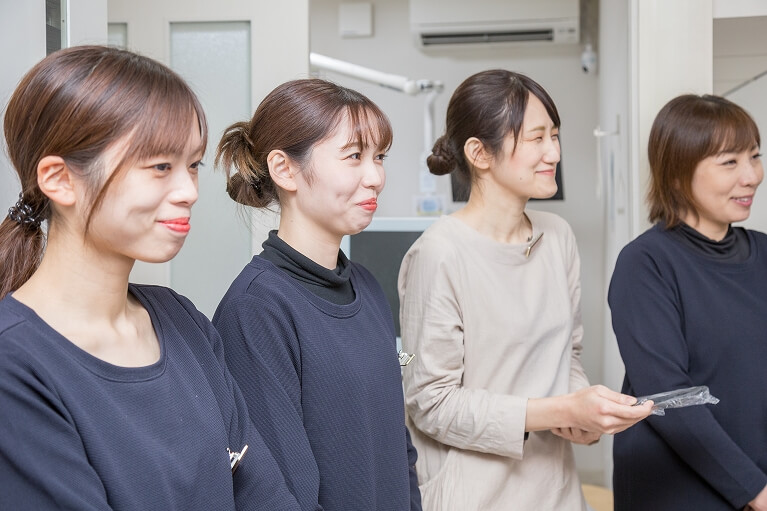 あすはな歯科医院のスタッフは全員、お子さまに恐怖心を与えないよう、あえて歯医者っぽくないワンピースを着ています。